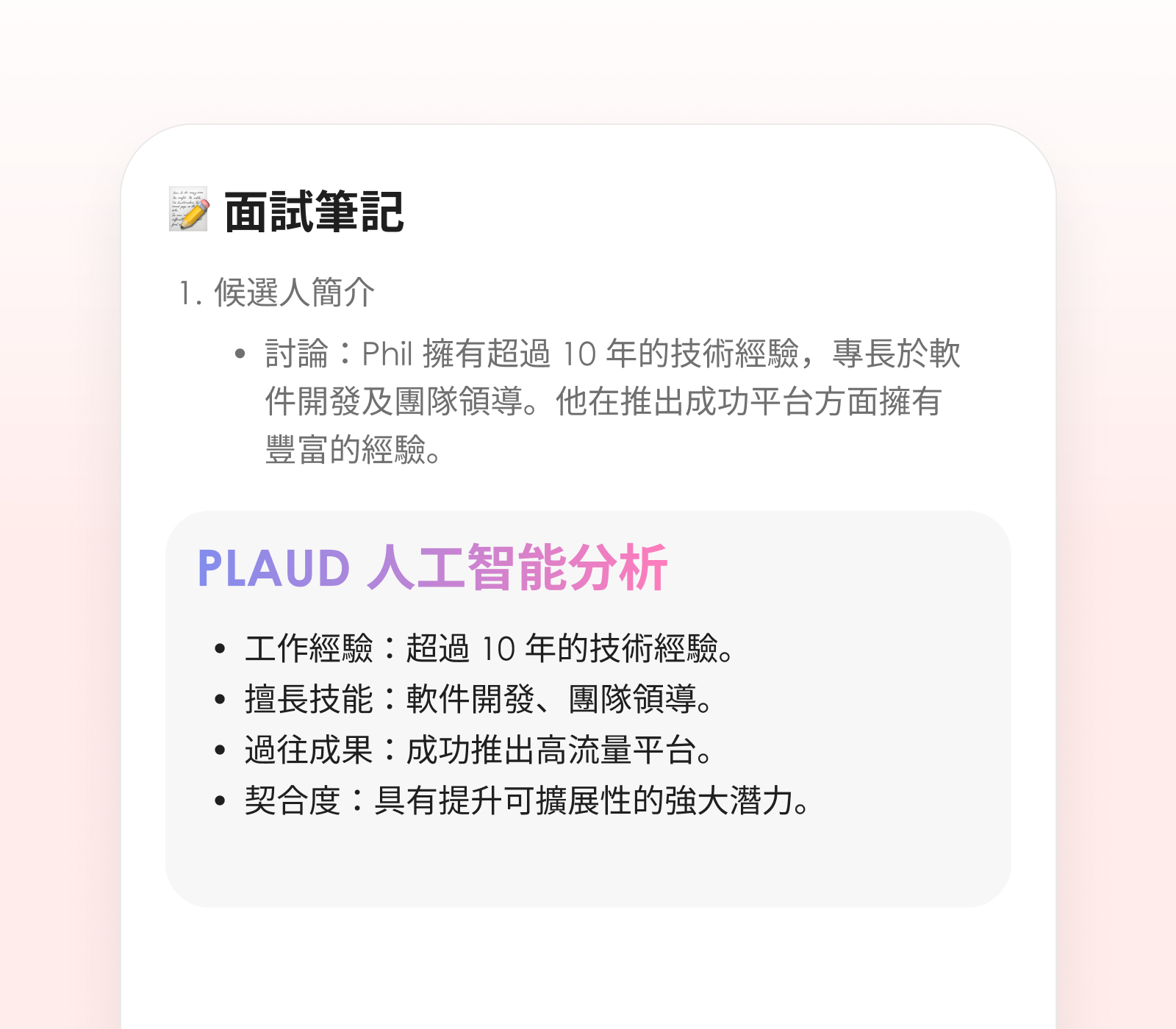 專注於每一次交流,產出專業格式的訪談紀錄與精華要點就交由 PLAUD NOTE。